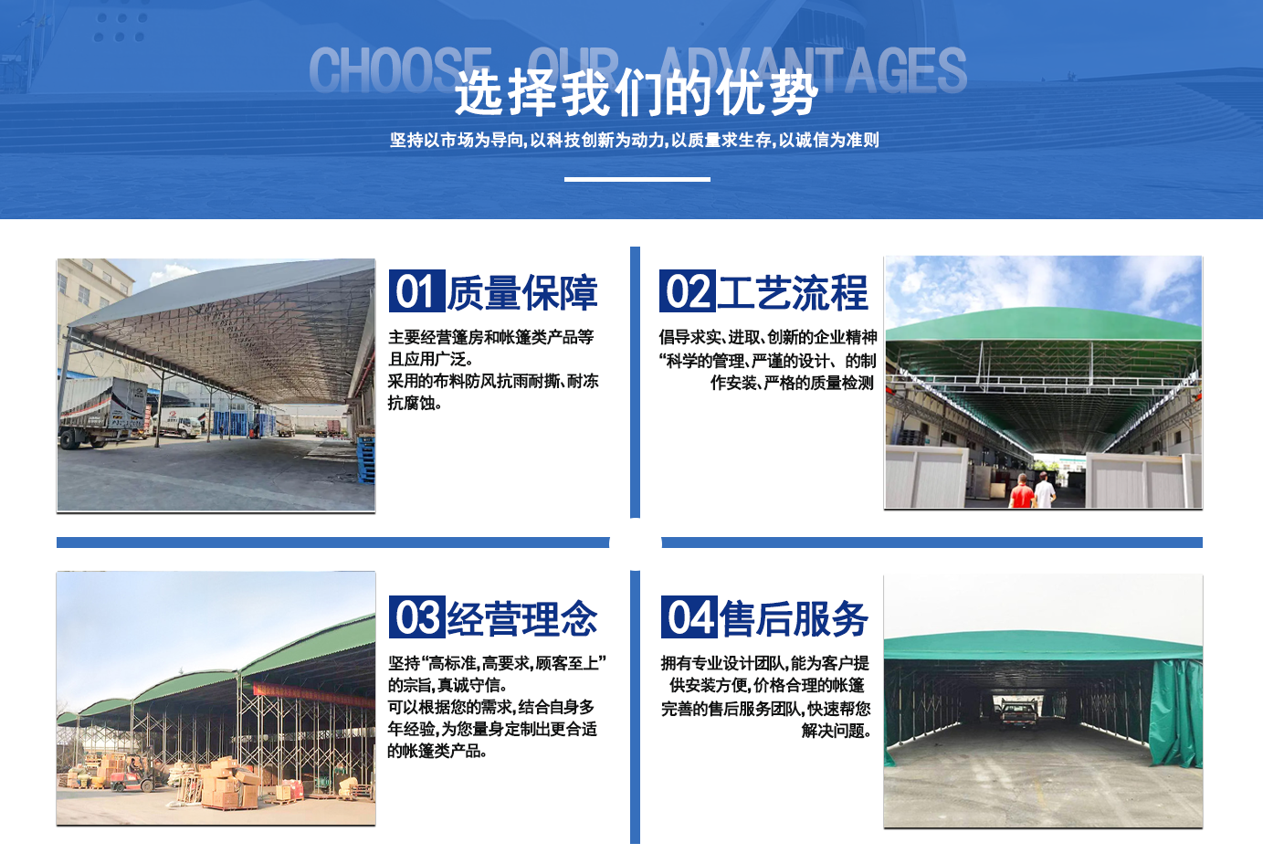 遼寧拓圖鋼結構工程有限公司是一家專業從事推拉篷設計、制作、安裝、使用、維修的綜合性公司。公司主營:電動雨棚、活動雨棚、倉庫雨棚、體育類雨棚、篷房、篷布、帳篷等系列產品的制作與安裝。 遼寧拓圖鋼結構工程有限公司堅持以市場為導向,以科技創新為動力,以質量求生存,以誠信為準則,倡導求實、進取、創新的企業精神?!翱茖W的管理、嚴謹的設計、 的制作安裝、嚴格的質量檢測、良好的后期服務成就企業的信譽,為您提供優(yōu)質服務。 遼寧拓圖鋼結構工程有限公司傾力于開發(fā)應用三維空間結構與新材料的結合,將廣告藝術視覺表現形式與張力膜材科學的結合,推出多彩推拉蓬,依靠先進的科學技術,將推拉蓬建筑表現形式無限延伸,立志走在建筑科學的前沿,引導建筑時尚潮流,我們的目標是使推拉蓬建筑在中國發(fā)展壯大?! ?nbsp; 遼寧拓圖鋼結構工程有限公司憑著極強的事業熱情和豐富的專業經驗以“勤勉進取、銳意創新、至誠至信”的精神使公司得到迅速健康發(fā)展,業務范圍遍及全國??茖W的管理、嚴謹的設計、高標準的制作安裝流程,嚴格把控產品質量,熱誠的售后服務是企業競爭力的源泉?! ?nbsp; 遼寧拓圖鋼結構工程有限公司人愿以最誠摯的態(tài)度,歡迎廣大客戶的蒞臨與溝通!愿為市場提供優(yōu)...